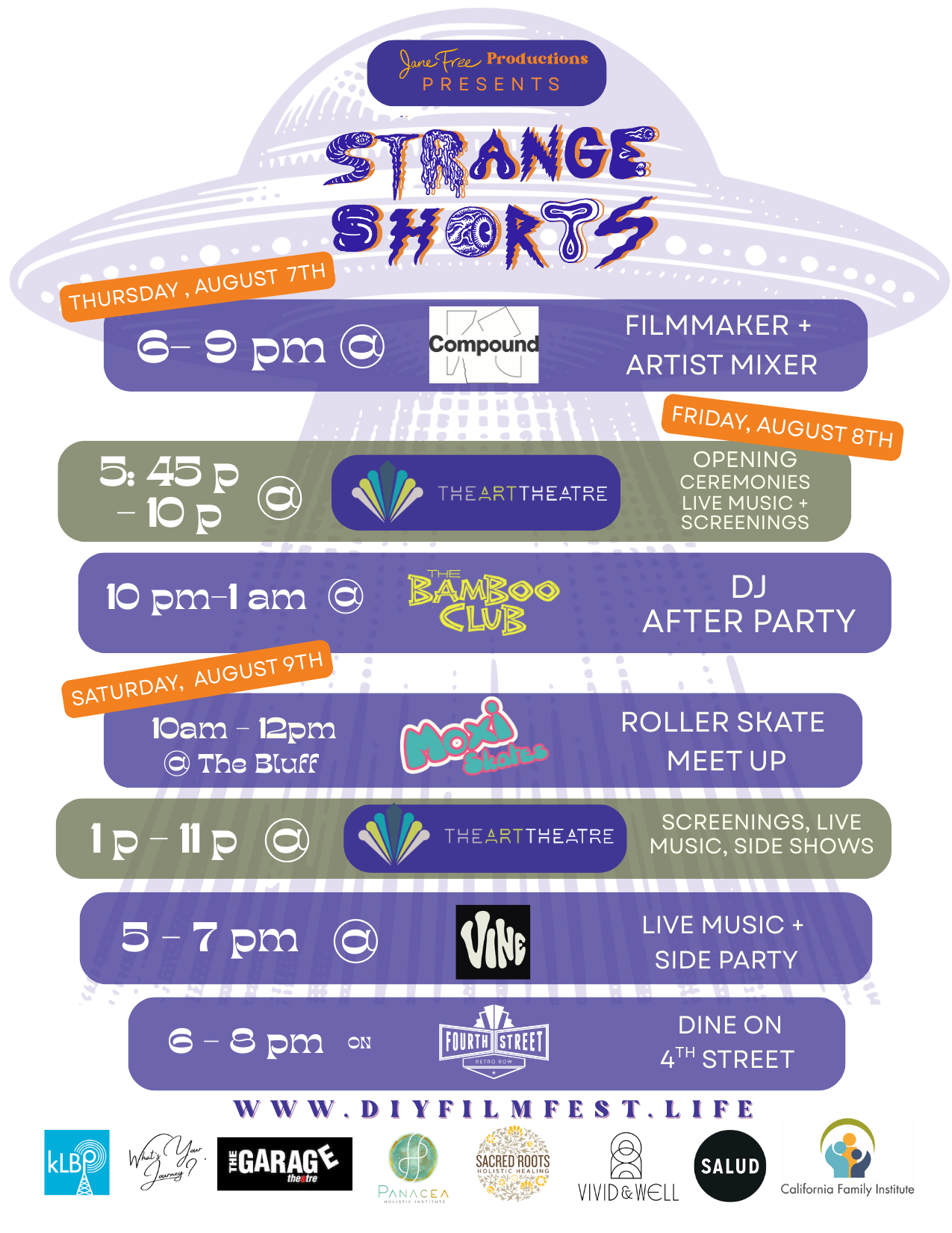 Join us for Strange Shorts, a juried film festival taking place at the world famous Art Theater in Long Beach, California on August 8th - August 9th 2025. See schedule below!